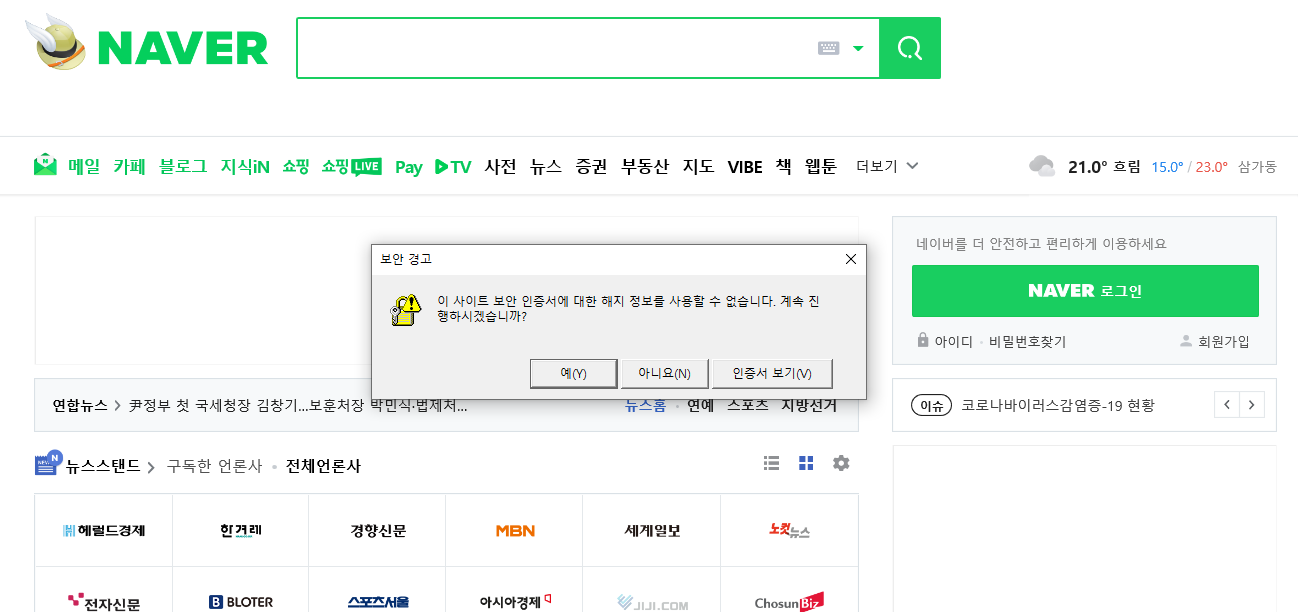 이 사이트 보안 인증서에 대한 해지 정보를 사용할 수 없습니다. 계속 진행하시겠습니까?