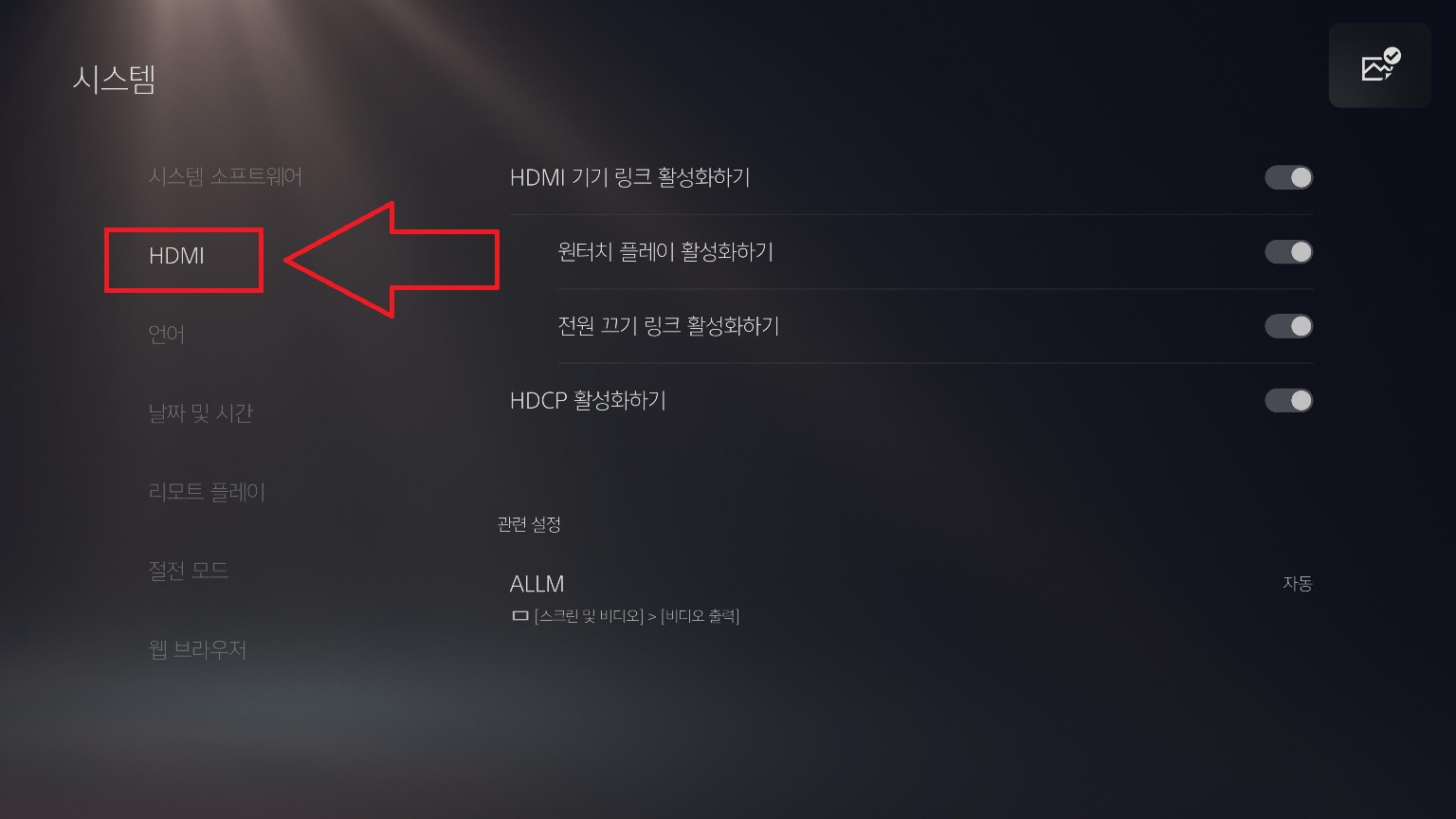 시스템 탭에 있는 HDMI로 들어가 주세요.